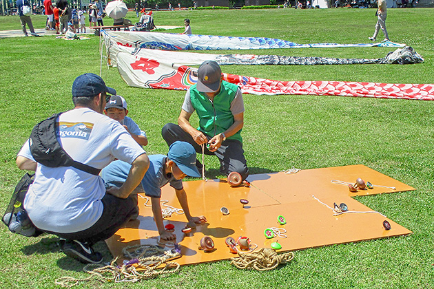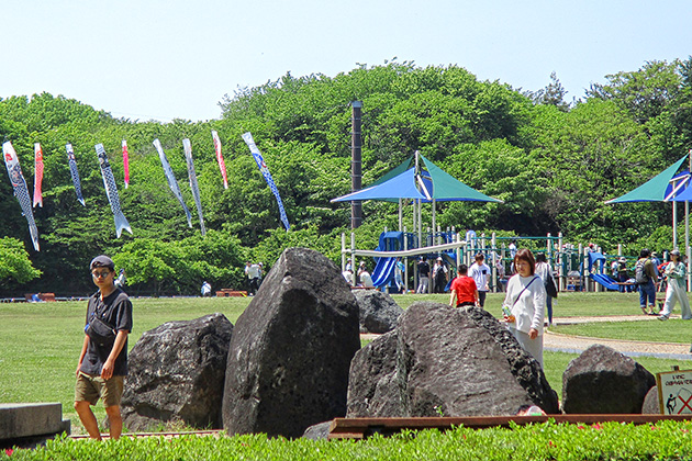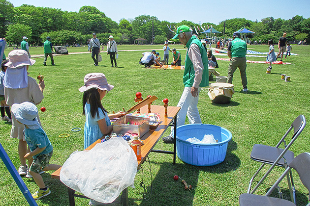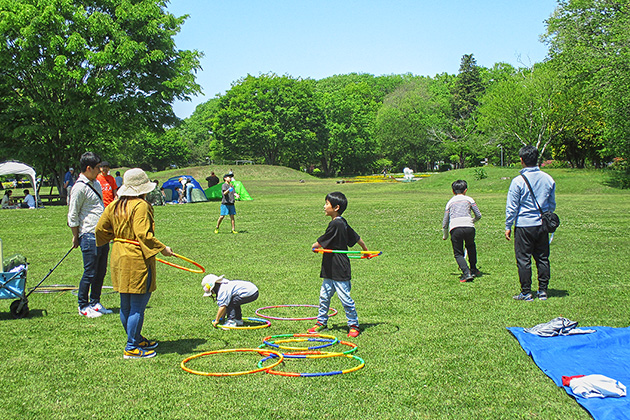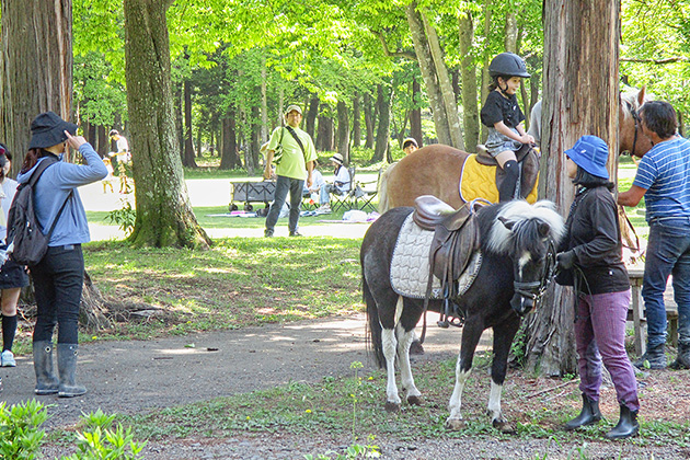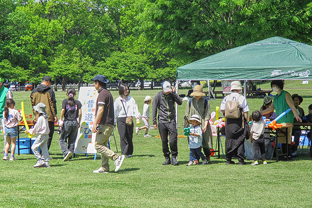 鯉のぼりが泳ぐ五月晴れの公園は、約1,200人が来場し、乗馬体験や昔遊びなどを楽しむ親子で賑わいました。
